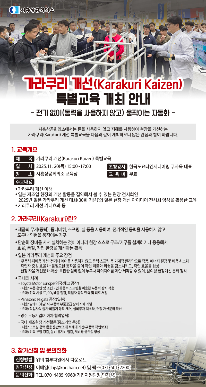 | ‒ | 전기 없이(동력을 사용하지 않고) 움직이는 자동화, 가라쿠리 개선(Karakuri Kaizen) 특별교육 개최 안내 |