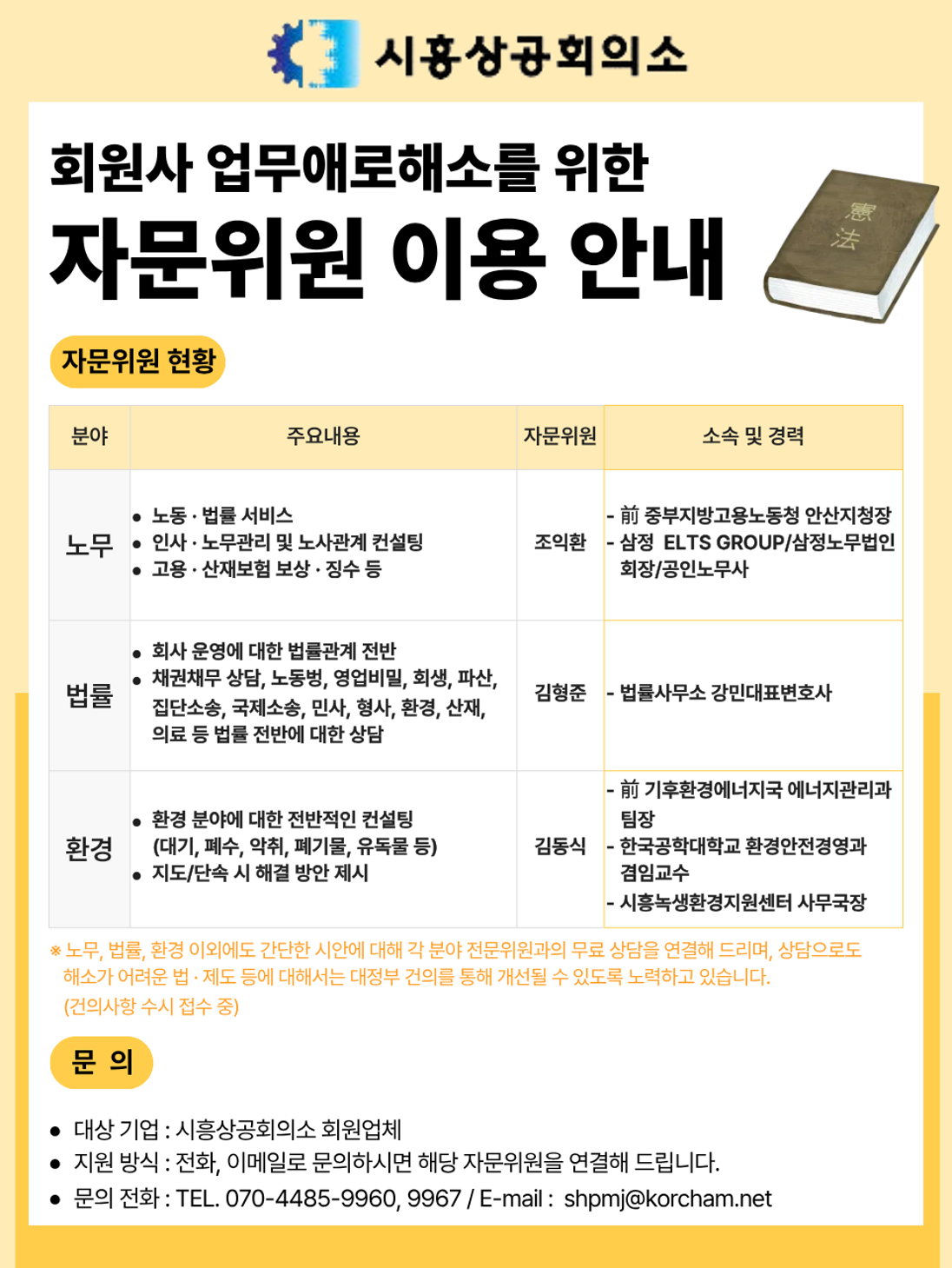 시흥상공회의소에서는 노무, 법률, 환경분야 회원사의 업무애로해소를 지원하오니 회원사의 많은 이용을 바랍니다.